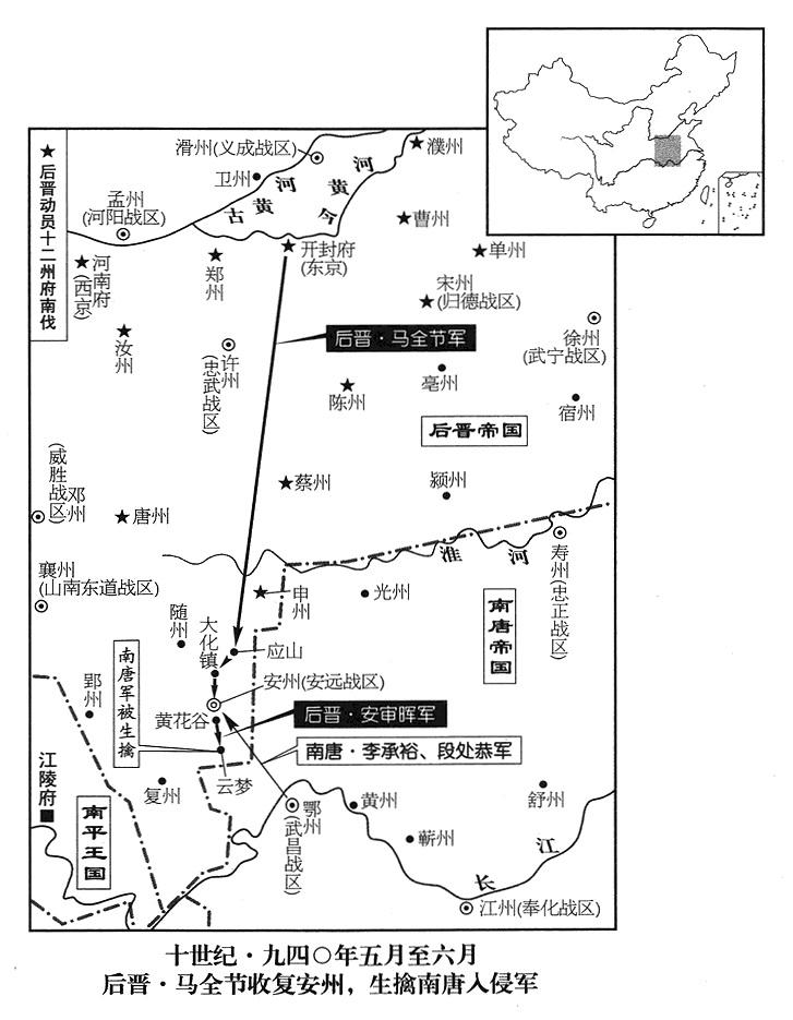 六月十日,后晋马全节自应山(湖北省广水市)进攻大化镇(广水市西南),跟李承裕在安州城南会战,大破南唐军。李承裕大掠安州,向南逃走,马全节进入安州。