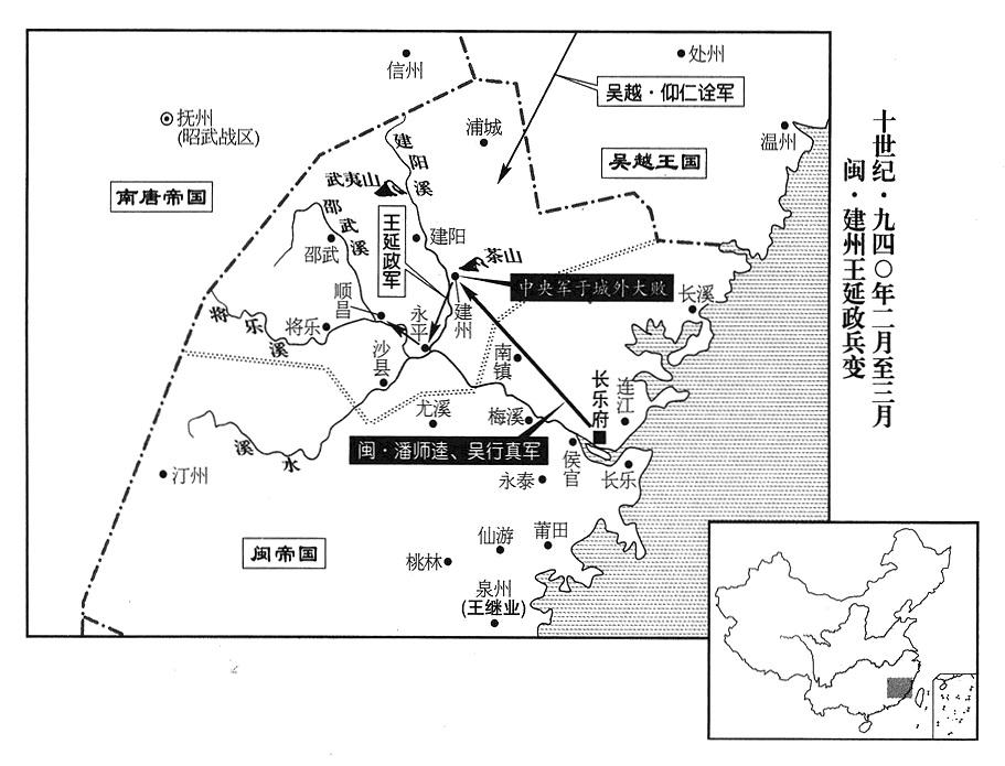 2、闽国(首都长乐府“〔福建省福州市〕”)建州(福建省建瓯市)州长王延政兴筑建州城,周围二十里,向闽王王延羲(王曦)请求设置威武战区,自己当战区司令官(节度使)。王延羲认为威武战区总部设在福州(即首都长乐府)为时已久,不应更改(唐王朝于福州置威武战区,参考八九六年九月;迄今四十六年);乃在建州另设镇安战区,命王延政当战区司令官,封富沙王。王延政不喜欢镇安两个字,改称镇武战区。