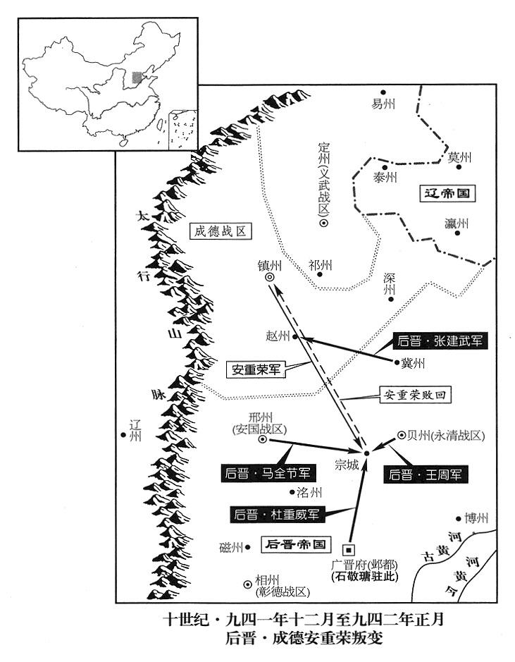 成德战区(总部设镇州“〔河北省正定县〕”)司令官安重荣,对于向辽国称臣一事深感羞耻。看见辽国使节,一定采用最不礼貌的姿势——叉开双腿坐在那里,信口诟骂;使节出境之后,安重荣有时还会派人追杀。辽国责备石敬瑭,石敬瑭只有道歉赔罪。