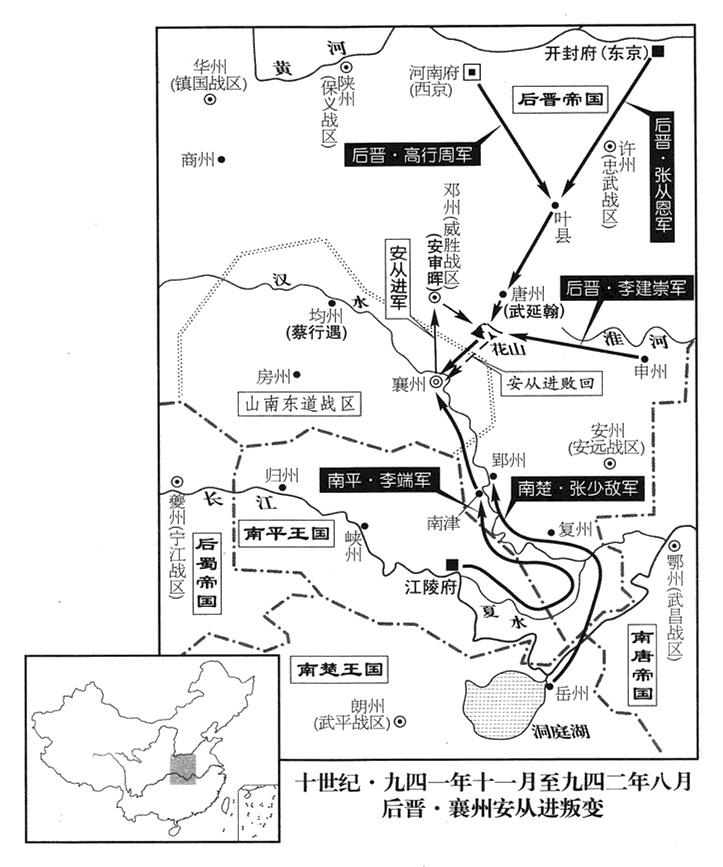 9、后晋山南东道战区(总部设襄州“〔湖北省襄樊市〕”)司令官安从进阴谋叛变,派使节前往后蜀,请出军进攻后晋的金(陕西省安康市)、商(陕西省商州市)二州,作为声援。