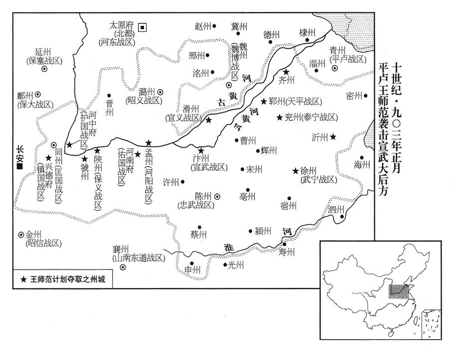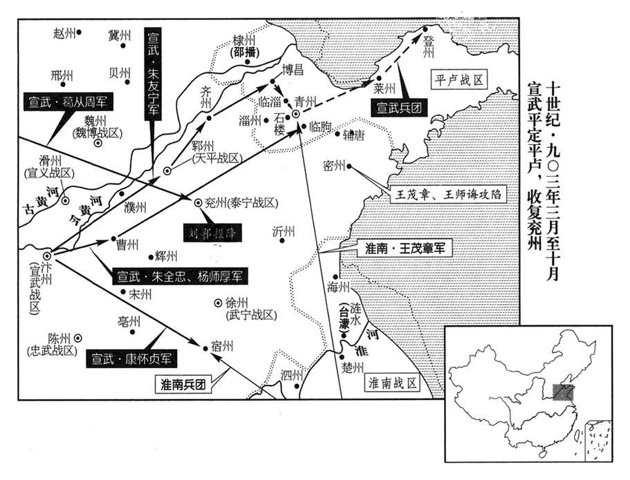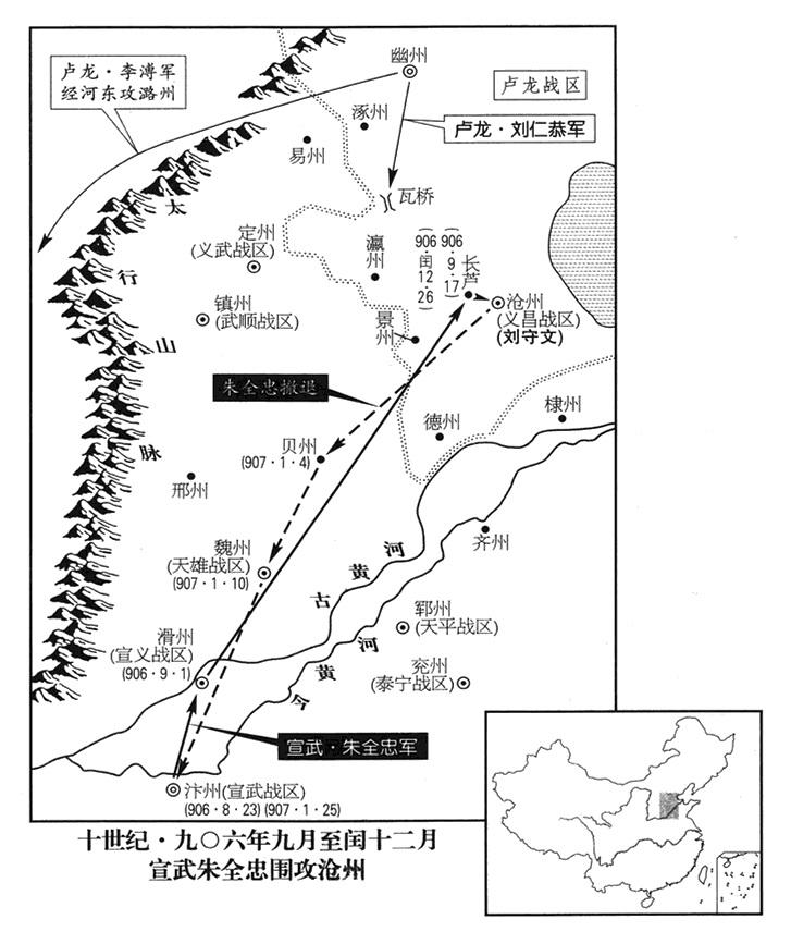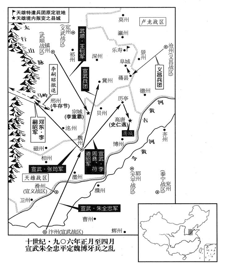 6、三月六日,朱全忠命亳州(安徽省亳州市)州长李思安当北方军团总指战官(北路行军都统),率军进攻卢龙。