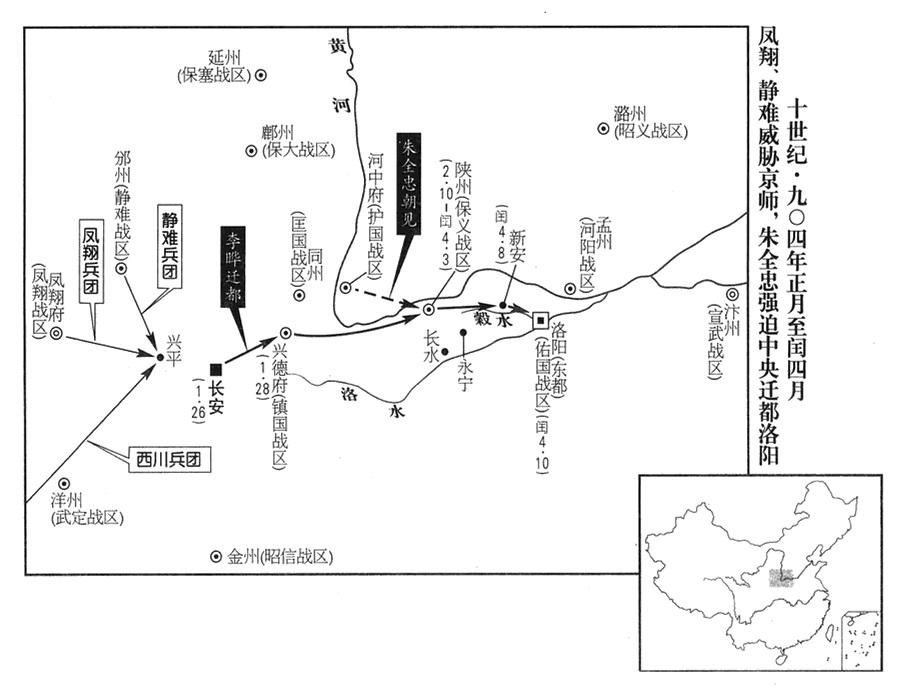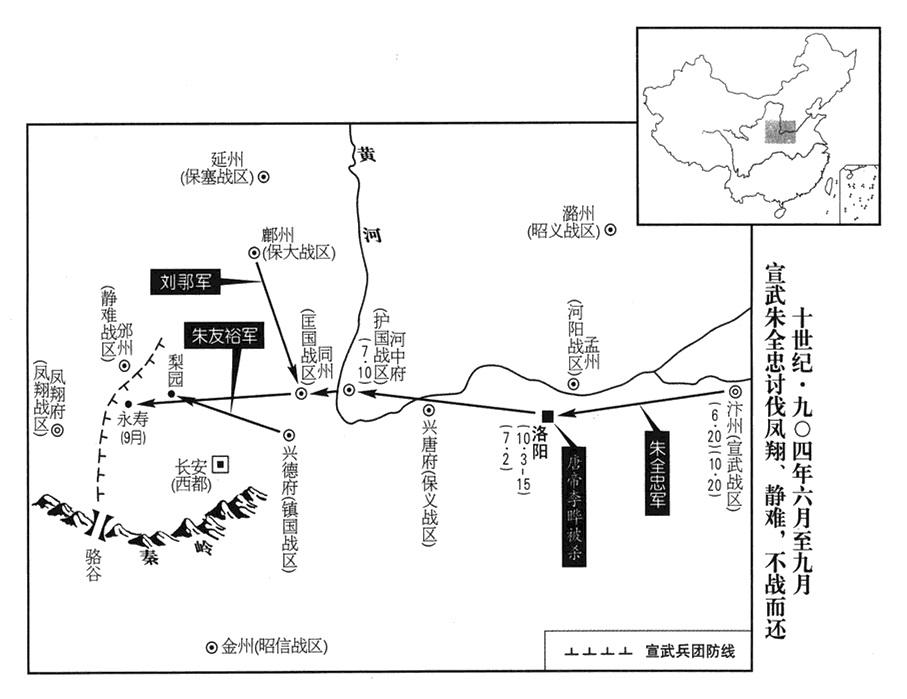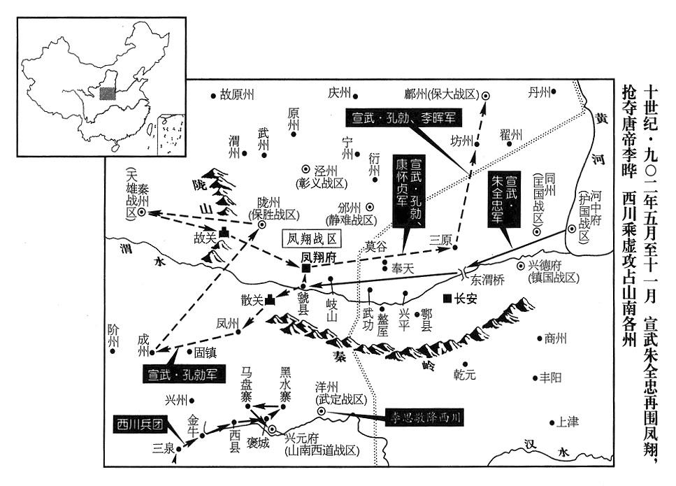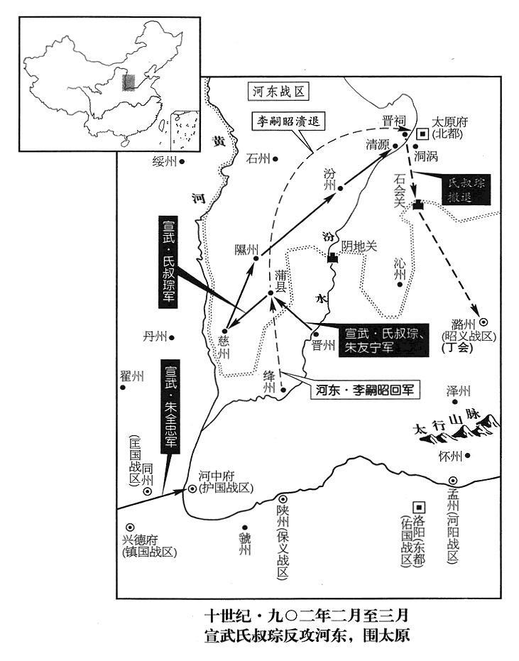 1、春季,正月六日,朱全忠(朱温·宣武“〔总部汴州〕”司令官)再进驻三原(陕西省三原县东北)。不久,移防武功(陕西省武功县西)。河东(总部太原府)将领李嗣昭、周德威进攻慈(山西省吉县)、隰(山西省隰县)二州,牵制朱全忠的兵力(二州州长已于去年“〔九〇一年〕”六月投降河东,或之后再次背叛)。