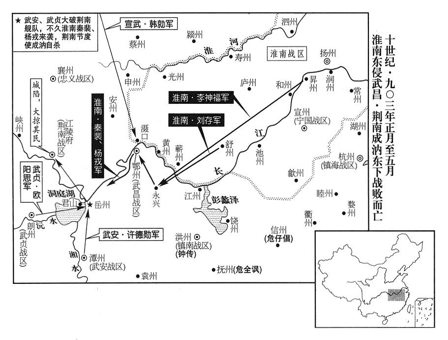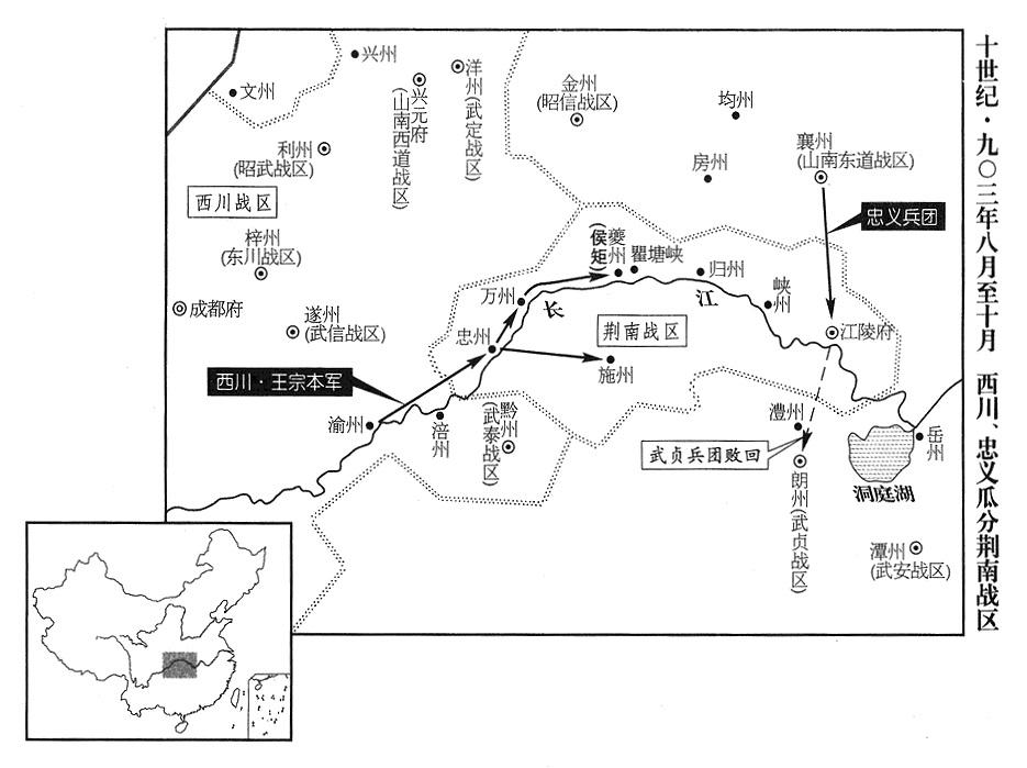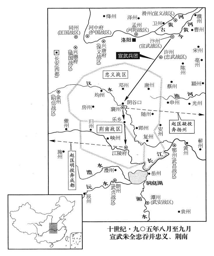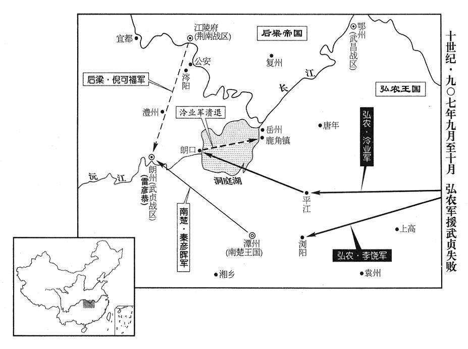34、武贞战区(总部设朗州“〔湖南省常德市〕”)司令官雷彦恭,会合南楚军,进攻江陵(湖北省江陵县),荆南战区(总部设江陵府)司令官高季昌率军进驻公安(湖北省公安县),切断武贞粮食供应,雷彦恭败退,南楚兵团也撤走。