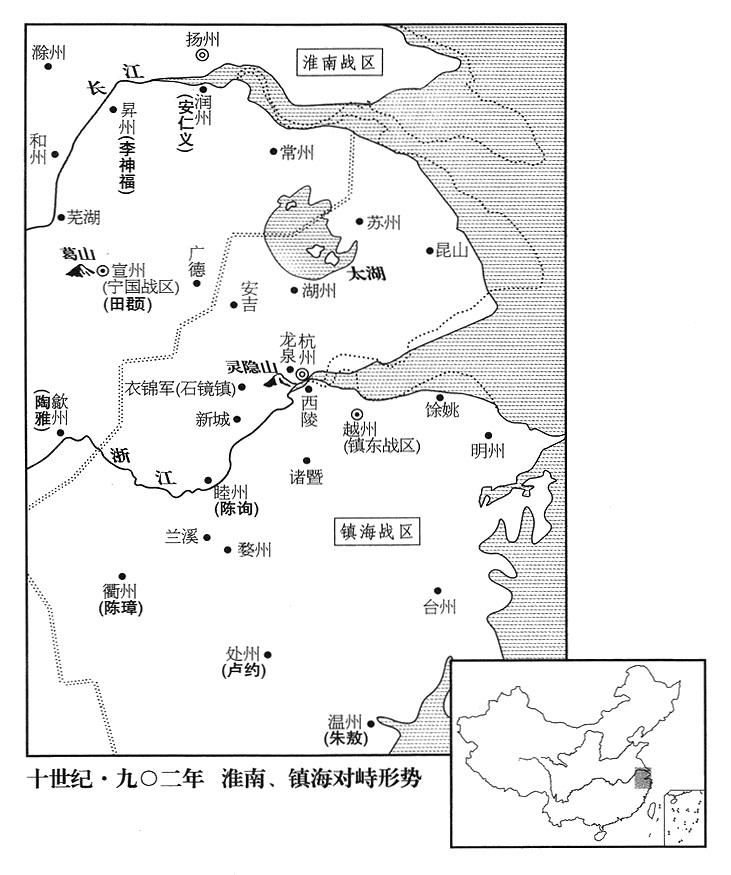 8、镇海战区(总部设杭州“〔浙江省杭州市〕”)暨镇东战区(总部设越州“〔浙江省绍兴市〕”)司令官吴王钱镠,派他的儿子钱传璙、钱传瓘讨伐卢佶割据的温州(浙江省温州市)。