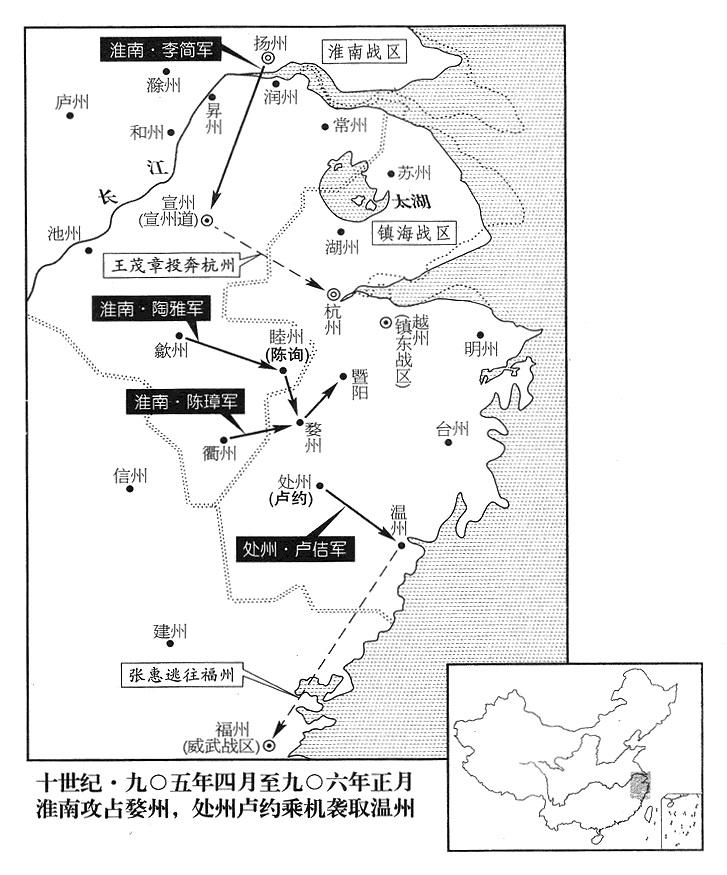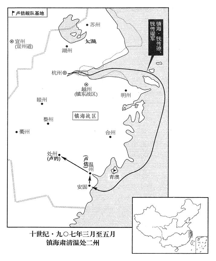 12、温州(浙江省温州市)州长卢佶听到钱传璙等就要到达消息,率水军在青澳(浙江省玉环县)抵抗。钱传瓘说:“卢佶的精锐部队都在这里,不必跟他硬拼。”于是,舰队一直南下,抵达安固(浙江省瑞安市),登上陆地,从小路进攻温州。