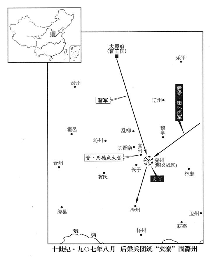25、五月十六日,后梁帝朱全忠命保大战区司令官康怀贞率军八万人,会合天雄兵团(总部魏州),进攻已被河东占领的潞州(山西省长治市)。