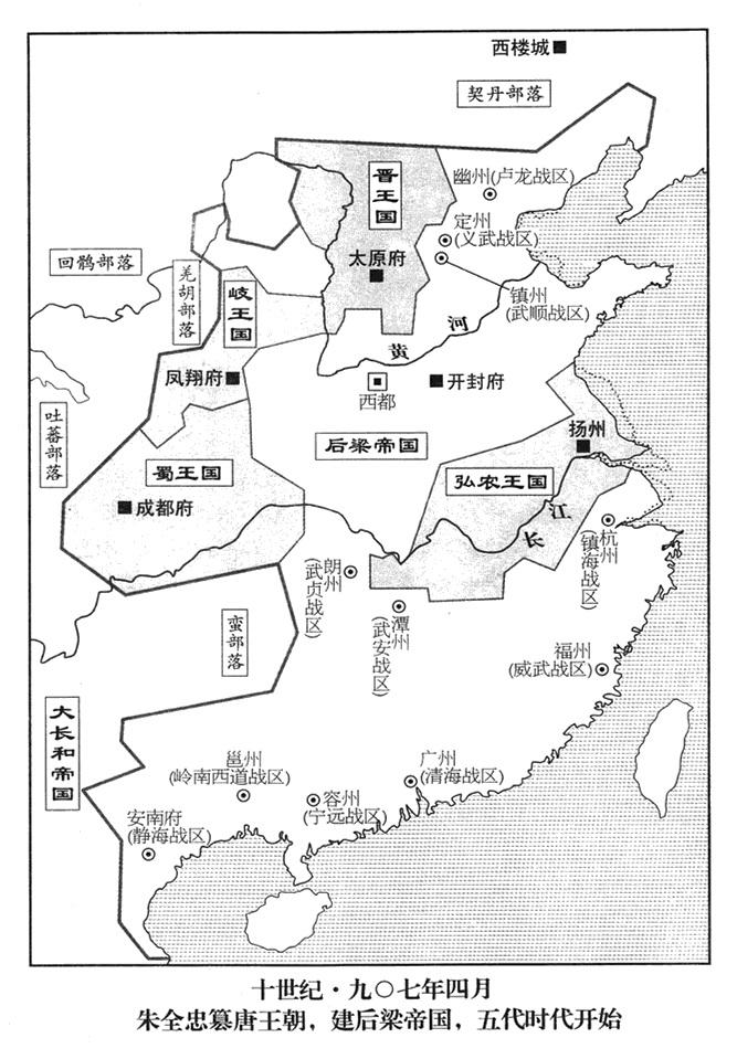 四月二十二日,朱全忠(本年五十六岁)大赦,改年号开平(之前是天祐四年,之后是开平元年),国号梁(南北朝时代有个梁,史称南梁;现在这个梁,史学家只好称后梁),封唐王朝亡国皇帝(二十五任哀帝)李柷当济阴王,一切都援照前代处置亡国之君的前例。唐王朝中央及地方所有的官员及爵位仍然保持。把汴州升格为开封特别市(开封府),称东都;唐王朝东都洛阳,改称西都;撤销唐王朝的西京(长安·陕西省西安市),把京兆特别市(京兆府)改称大安特别市(大安府),仍设佑国战区(总部设大安府“〔陕西省西安市〕”),把魏博战区(总部设魏州“〔河北省大名县〕”)改名为天雄战区(九〇四年闰四月已改,不知道为什么又提出)。把济阴王李柷押送曹州(山东省定陶县)软禁,用荆棘把他住的地方围绕起来,并派官兵全副武装看守戒备。(辉煌的唐王朝终于灭亡,共有二十五任君王、二十二个皇帝“〔李显、李旦、李晔三人都当过两任〕”,立国二百七十六年“〔六一八年至六九〇年·七〇五年至九〇七年〕”,中国人一度称为唐人,世界各大都市华人聚集地方,也译称唐人街。九任帝李隆基把唐王朝带入战乱后,人民遂再没有宁日,这种政府拖得越久,人民的痛苦也越深。可是代之而起的新统治阶级更糟,中国人的颟顸和驯服,恰恰是专制魔王实行封建残暴统治的能源。后梁帝国建立后,七十年间,中原地区前仆后继的建立了五个短命帝国,而在其他地区同时并存的又有十一国之多,有的表面上向中原五个短命帝国臣服,有的索性自己建独立政权,史称“五代十一国”,也称“小分裂”“〔针对大分裂而言〕”,时间只七十三年“〔九〇七年至九七九年〕”,到本“〔十〕”世纪七〇年代,宋王朝政府才重归统一。)