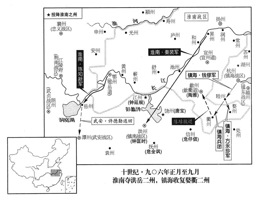 29、弘农王杨渥命鄂岳道(首府设鄂州“〔湖北省武汉市〕”)行政长官(观察使)刘存当西南方面军总征剿司令(西南面都招讨使);命岳州(湖南省岳阳市)州长陈知新当岳州民兵司令(团练使);命庐州道(首府设庐州“〔安徽省合肥市〕”)行政长官刘威当援军司令(应援使);命别动部队将领(别将)许玄应当监军官(监军),率水军三万人,进攻南楚(首都潭州)。南楚王(一任武穆王)马殷大为恐惧。静江基地司令(军使)杨定真道贺说:“我们一定胜利!”马殷问他缘故,杨定真说:“面对战争,戒慎恐惧的一方一定胜利,骄傲松懈的一方一定失败。淮南大军直扑我们首府,不但骄傲,而且轻敌。大王却在脸上露出畏惧的颜色,所以我知道我们必胜。”