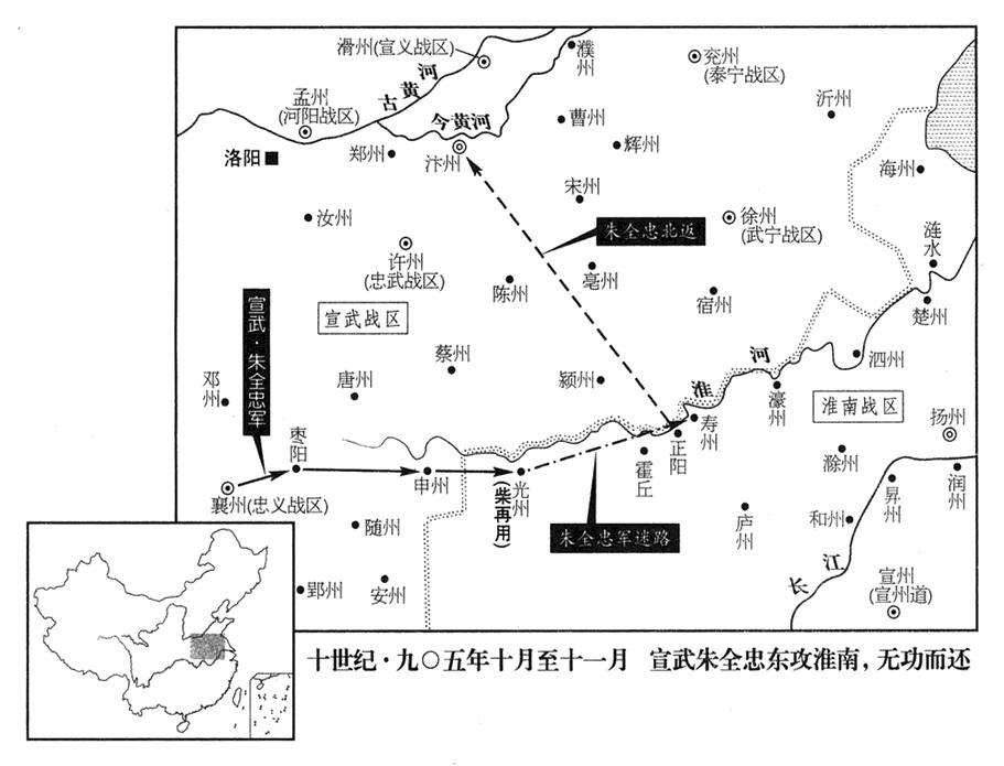 3、最初,朱全忠认为黄河以北各战区全都臣服,只有卢龙(总部幽州)、义昌(总部沧州)还在抗拒,所以采取大规模军事行动,想用战场上的胜利使各战区归附得更为坚定。想不到昭义(总部潞州)在内部背叛(参考去年“〔九〇六年〕”十二月),朱全忠只好烧毁营房撤退,威望下降。恐怕中央与地方离心,打算迅速篡夺唐王朝政权,用来镇压。