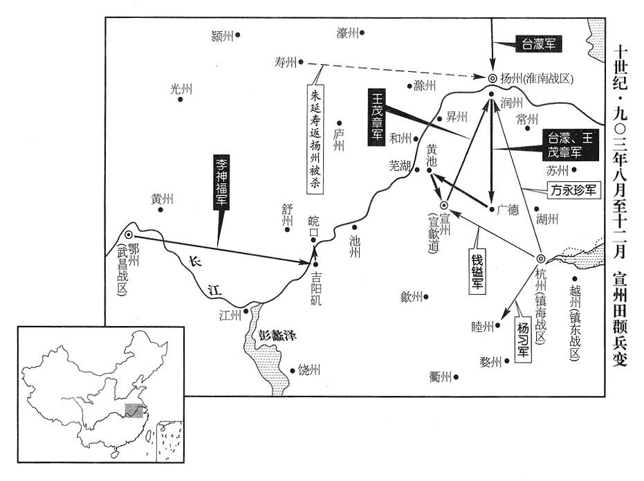 19、武宁战区(流亡总部设昇州“〔江苏省南京市〕”)司令官冯弘铎,夹在淮南跟宁国(总部宣州)之间,一直感到威胁,然而,仗恃自己楼船舰队强大,所以也不肯以低姿态跟两战区相处。宁国战区(总部设宣州“〔安徽省宣州市〕”)司令官田頵(音jūn“〔君〕”)打算对他采取行动,遂招募曾经给冯弘铎建造楼船战舰的工匠,来给自己建造普通战舰,工匠说:“冯大帅(冯弘铎)派人到很远的地方购买最结实的木材,所以他的战舰持久耐用,您这里没有这种木材!”田頵说:“你们只管动手,我只要用一次就够!”