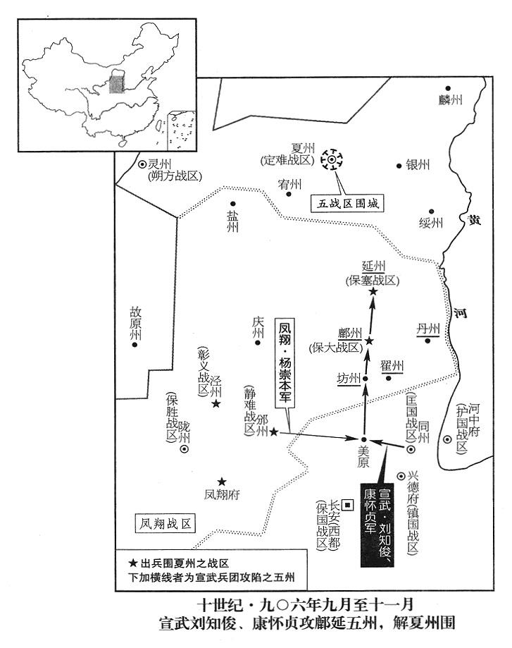 40、朱全忠派部将孔勍、李晖,乘保大战区防务空虚(军队都随司令官李茂勋出征),进攻鄜(陕西省富县)、坊(陕西省黄陵县)二州。