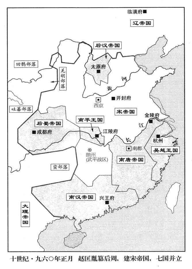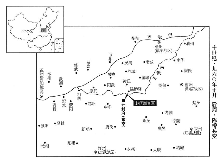 1、春季,正月一日,后周帝国(首都开封府“〔河南省开封市〕”)皇帝(三任恭帝)郭宗训(本年八岁),登金銮宝殿接受文武百官朝贺。镇(河北省正定县)、定(河北省定州市)二州紧急军情奏报说:辽国(首都临潢府)大军,跟后汉(首都太原府)大军联合南下入侵。郭宗训命归德战区(总部设宋州“〔河南省商丘市〕”)司令官(节度使)摄理太尉(检校太尉·三公之一)、殿前护从总司令(殿前都点检)赵匡胤,率中央禁卫军北上抵御。赵匡胤掌握军事政治大权,有六年之久,深得军心,好几次随从二任帝郭荣(柴荣)南征北战,立下汗马功劳,大家对他都十分敬仰。而现在,新君年纪太小,人心猜忌不安,将士们阴谋拥护赵匡胤篡夺政权。
