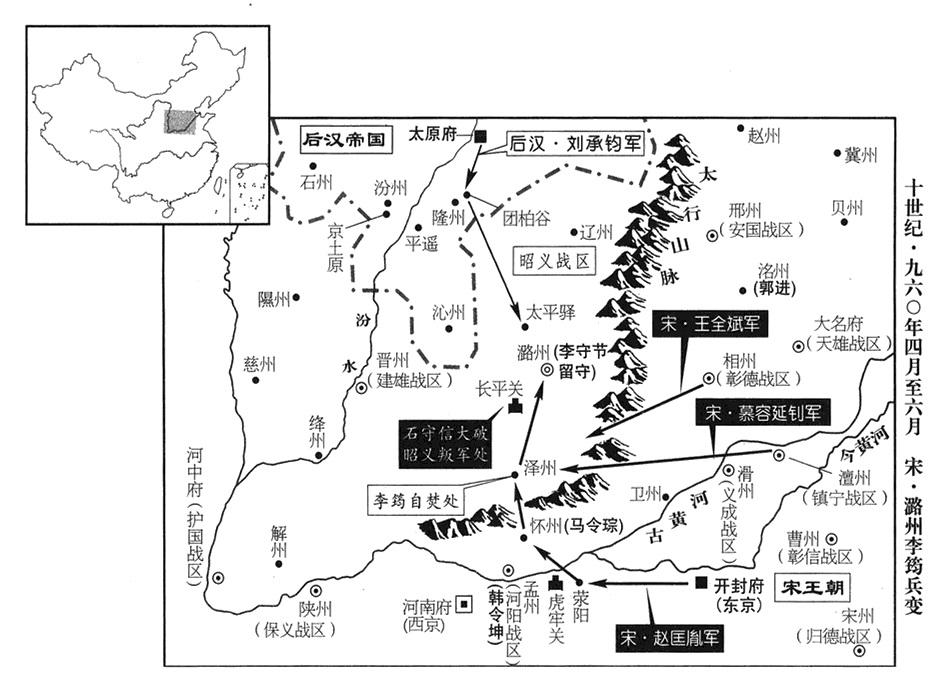 16、宋帝赵匡胤加授昭义战区(总部设潞州“〔山西省长治市〕”)司令官太原人李筠(李荣)中央官衔:最高立法长(中书令·使相)。使节抵达潞州,李筠当时就要拒绝,左右侍从官员恳切劝告,才算接待,在音乐声中举行宴会,不久却取出后周一任帝(太祖)郭威的画像,悬挂厅堂,流泪涕泣不已。宾客们十分惊恐,告诉使节说:“我们大帅一喝酒就失去常态,请不要见怪。”后汉帝(四任睿宗)刘承钧(本年三十五岁)得到消息,派出间谍,用蜡丸传递书信,要求跟李筠同时出军南下。李筠的长子李守节哭泣苦劝,李筠不接受。赵匡胤亲笔书写诏书慰问安抚,并且召唤李守节当皇城管理官(皇城使)。李筠遂派李守节前往京师(首都开封府)察看动静,赵匡胤一看到李守节就呼叫说:“皇太子,你为什么来这里?”李守节蓦地一惊,用头叩击地面,说:“陛下怎么说这样话,一定有人谗害我们父子!”赵匡胤说:“听说你不断劝告你父亲,你父亲不听,所以派你前来,只是要我把你杀掉而已。回去告诉你老爹:我没有当皇帝的时候,任由你想干什么就干什么,我既然已当上天子,你难道不能稍稍让我?”李守节飞马回去报告李筠,李筠遂命幕僚撰写文告,宣布赵匡胤篡位罪状。