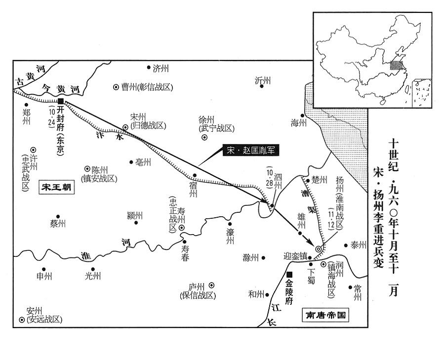 赵匡胤得到李重进聚众起兵消息,任命石守信当扬州特遣兵团总司令(扬州行营都部署),兼主管扬州特遣州政府(兼知扬州行府事):命王审琦当副手、李处耘当总辅导官(都监)、宋延渥当阵地总督战官(都排阵使),率中央禁军讨伐李重进。
