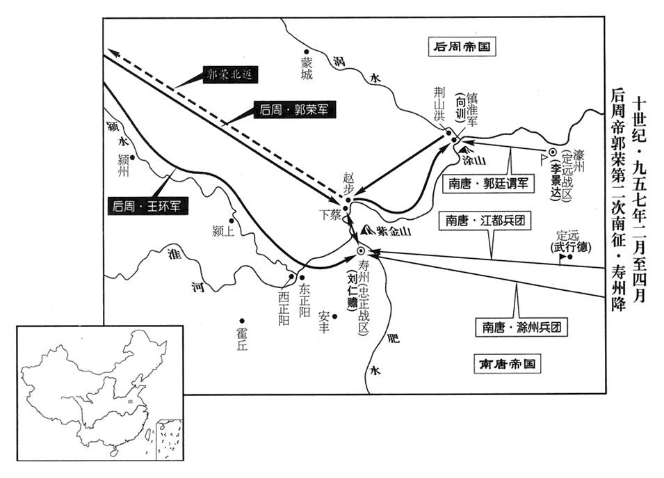 正月二十二日,郭荣到寿州城下,在淝水(东淝河)以北扎营,下令各路人马包围寿州,把架在正阳(西正阳跟东正阳之间)水面的浮桥,移到下蔡镇(安徽省凤台县)。