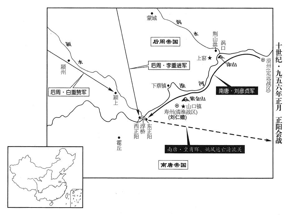 28、后周南征军统帅李穀等在淮河上建造浮桥,从正阳(西正阳·安徽省颍上县东南淮河渡口“〔正阳也属双子城,淮河西岸属后周,称西正阳;淮河东岸属南唐,称东正阳。淮河贯穿其中〕”)南渡淮河。