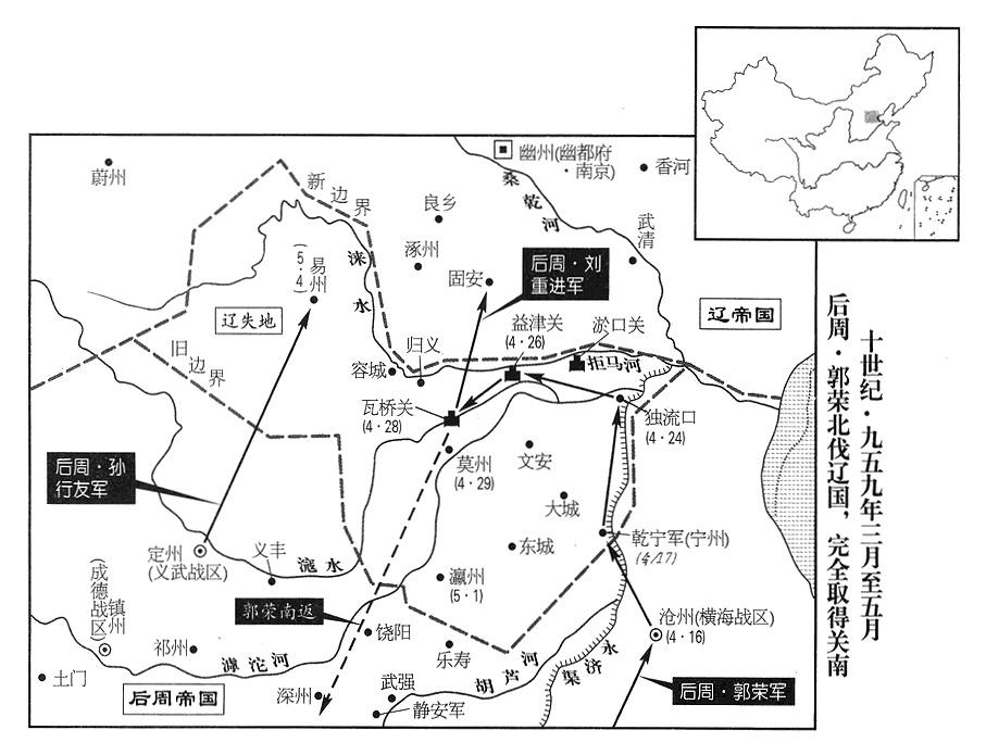 五月二日,郭荣在御营设宴款待各将领,商议进攻幽州(北京市),将领们一致说:“陛下出京(首都开封府)四十二天(郭荣三月二十九日离大梁,迄五月二日,前后三十二天。“四”当是“三”字抄误),刀口没有染血,就完全平定燕南(河北省中部),这是举世难得的辉煌成果。辽国精锐骑兵,聚集幽州以北,不应该深入敌人国土。”郭荣大不高兴。当天,催促先锋总指挥官(先锋都指挥使)刘重进先行出发,进驻固安(河北省固安县),郭荣也前进到安阳水(海河支流,流经河北省霸州市北,今已湮没),下令造桥,因天色已晚,返回瓦桥住宿。当天(五月二日),郭荣突然感到身体很不舒适,才停止行动。